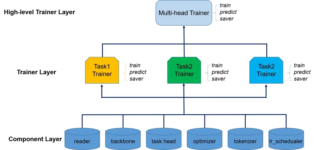 高级训练器层:用于复杂的学习和推理策略,如多任务学习。通过添加辅助任务来训练健壮的NLP模型(提高模型的测试集和领域外的性能),或者联合训练多个相关任务来获得每个任务的更高性能。