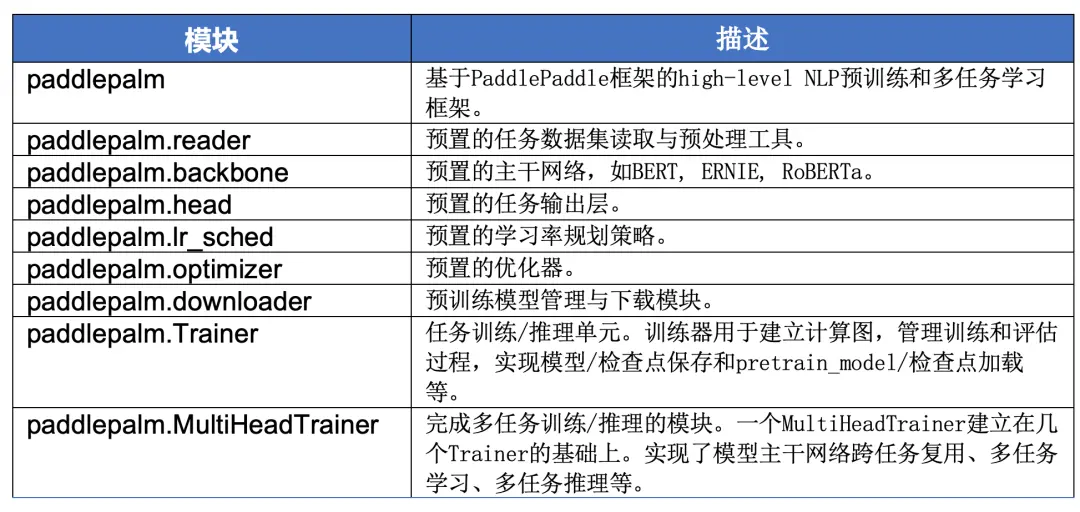 组件层:PALM提供了6个 解耦的组件来实现NLP任务。每个组件包含丰富的预定义类和一个基类。预定义类是针对典型的NLP任务的,而基类则是帮助用户完成该组件的自定义。