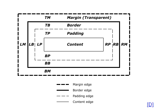 ○ 外边距边界围绕着盒子的外边距。若是外边距的宽度为0,外边距边界就与边框边界相同。这四条外边距边界定义了盒子的外边距盒(margin box)即margin+Border+Padding+Content这个矩形
