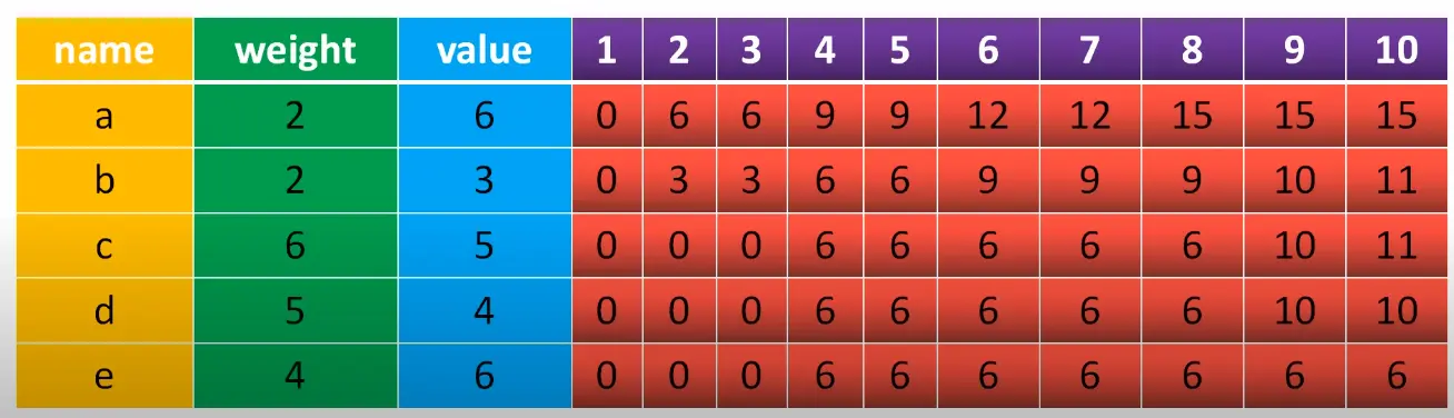 - 理解01背包问题的表格,假设有a,b,c,d,e五个物体,其重量分别为2,2,6,5,4,价值分别为6,3,5,4,6,当背包可容纳的重量从1变化到10时,最大的价值