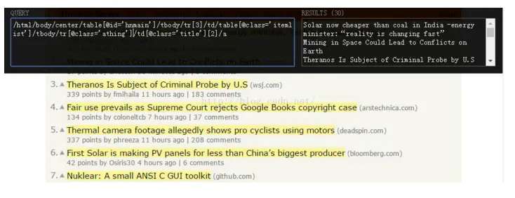 html :h2.getElementsByTag("span").first().text(); Xpath:/center/table[@id='hnmain']/tbody/tr[3]/td/table[@class='itemlist']/tbody/tr[@class='athing']/td[@class='title'][2]/a chrome命令行可以直接获取,推荐 chrome扩展Xpathhelper实际使用中可以精简一下