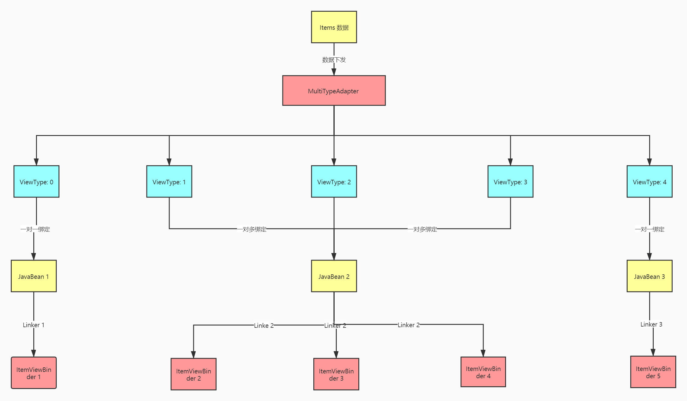 框架底层维护了一份映射表,这份映射表对应 ViewType ,JavaBean Class, Linker, ItemViewBinder的四重绑定。