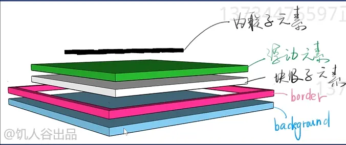 background在最底层,向上依次是border、块级子元素、浮动元素、内联元素(文字内容),见3D示意图: