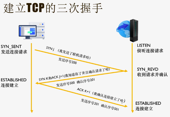三次握手: - 客户端向服务端发送连接请求,并进入等待服务器确认状态 - 服务器收到请求并确认,发给客户端,进入等待客户端确认状态 - 客户端进入连接建立状态后,向服务端发送消息已收到建立连接的请求,服务端收到消息进入连接建立状态