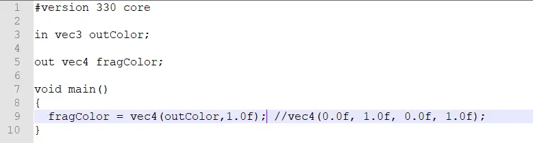 接着将顶点的颜色传递到片段着色器,片段着色器啥也没干,直接将顶点的颜色输出到下一阶段进行处理。