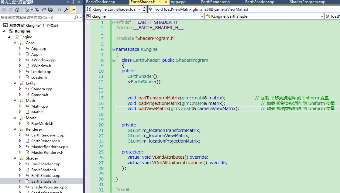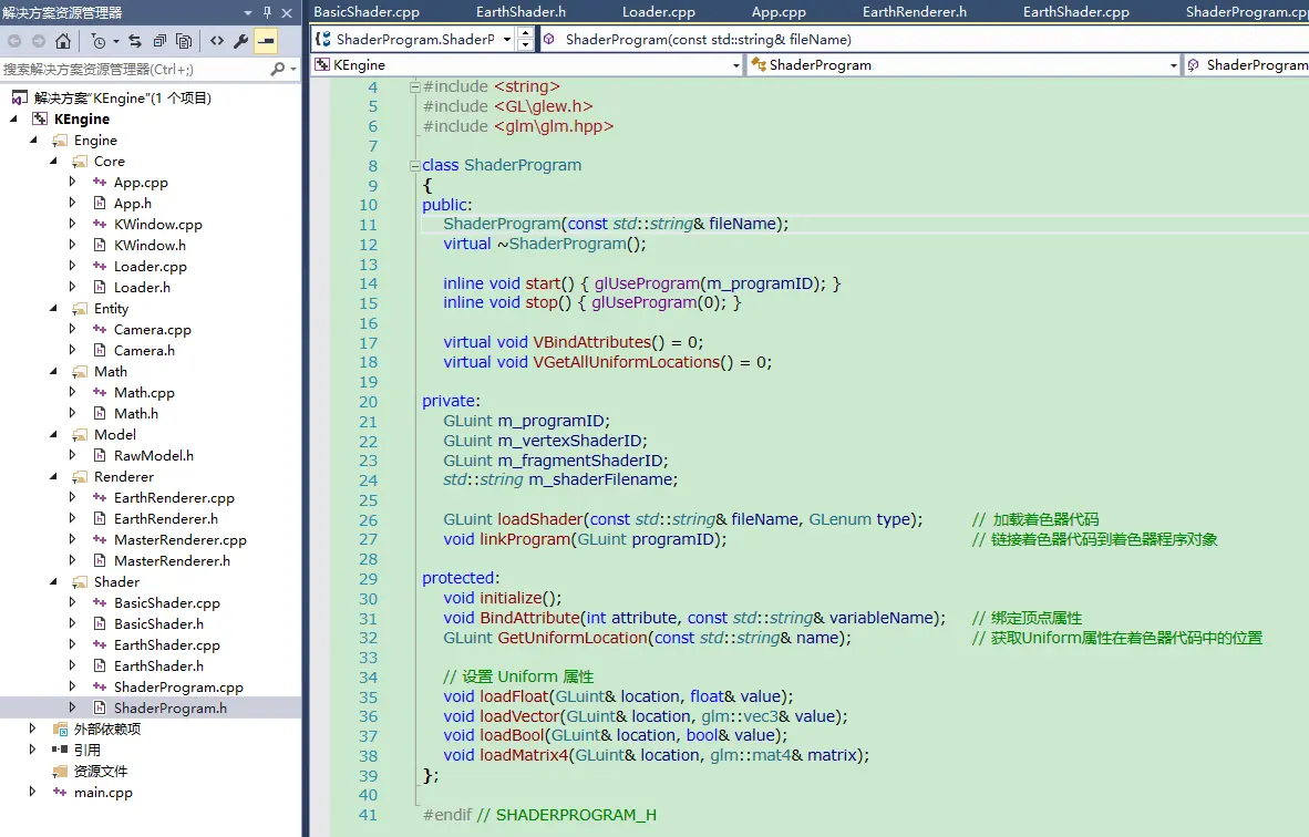 - 首先,我们新建一个ShaderProgram类,封装处理shader的过程:编译、链接、开启、禁用shader等。