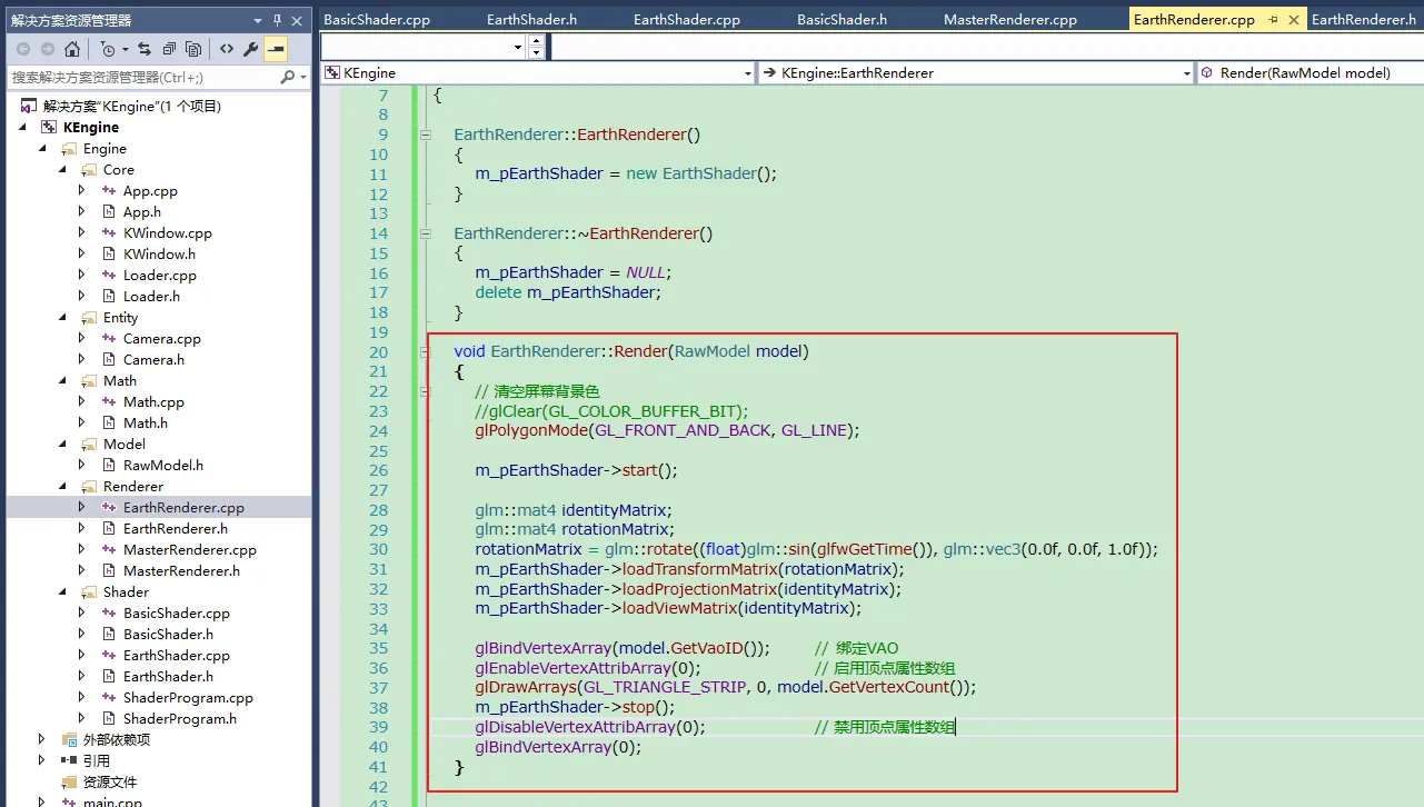 - 然后,我们定义了一个EarthRenderer专门来负责渲染地球。它在MasterRenderer中被调用,这样我们就可以将渲染特定物体的代码从MasterRenderer中分离,方便维护。