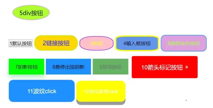 - 本文所示12种按钮开关样式分别为:div按钮,默认按钮,链接按钮,圆角按钮,输入框按钮,悬停变色按钮,阴影按钮,悬停出现按钮,禁用按钮,箭头标记按钮,波纹按钮和按压效果按钮。