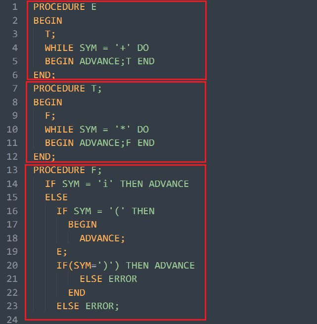 基于改写后的文法或者是语法图,可以构造如下的递归下降分析程序(ADVANCE 表示扫描下一个输入符号,SYM 表示当前输入符号,ERROR 表示出错纠察处理程序):