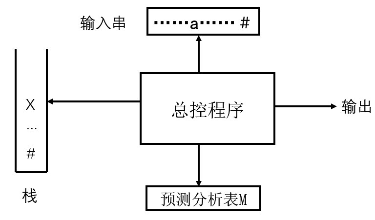 预测分析程序的核心是借助一张分析表以及一个栈。分析表是一个 M[A,a] 形式的矩阵,A 表示非终结符,a 表示终结符或者 #,矩阵的每一个元素 M[A,a] 都存放着一条关于 A 的产生式,表示当 A 面对输入符号 a 的时候应该使用什么样的右部去进行替换;元素也可能存放一个出错标志(在表中用空白表示),这时候表示分析出错: