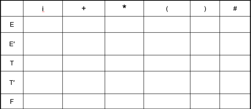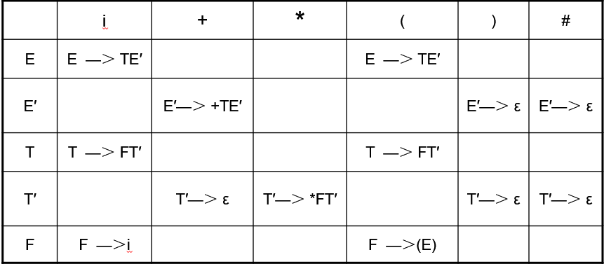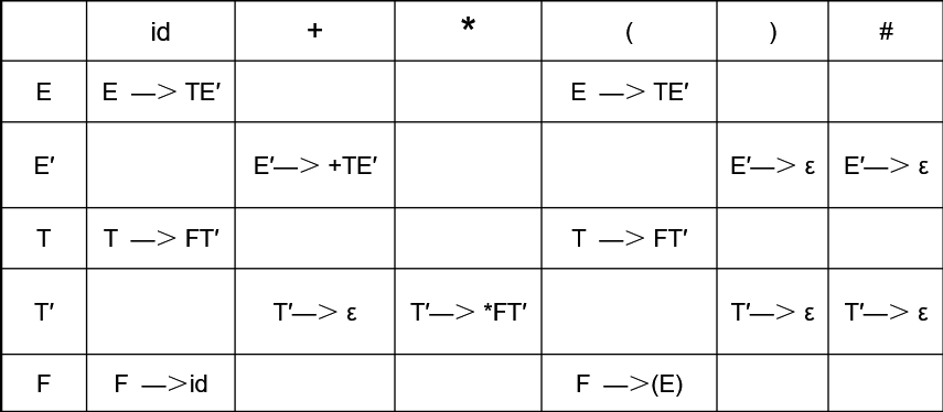 比如说,终结符 i 存在于 select(E → TE') = {i,(},select(T → FT') = {i,(},select(F → i) = {i} 中,那么就把 E → TE' 填入 E 对应于 i 的矩阵元素中,把 T → FT' 填入 T 对应于 i 的矩阵元素中,以此类推。所以,我们最终得到了如下的预测分析表: