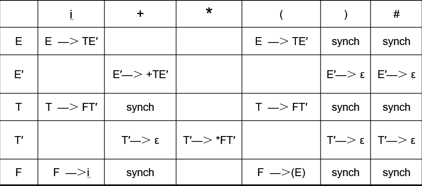 这样,在进行分析的时候,如果矩阵元素还是空,则跳过当前输入符号;如果矩阵元素为 synch,则弹出栈顶非终结符;如果栈顶终结符和输入符号不匹配,则弹出栈顶终结符。