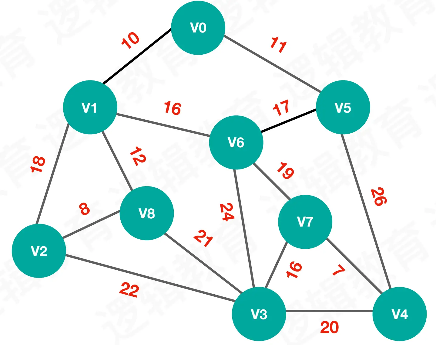 更新lowcost 数组与adjvex 数组的条件: 1. 与顶点k 之间有连接 2. 当前结点 j 没有加⼊过最⼩⽣成树; 3. 顶点 k 与 当前顶点 j 之间的权值 ⼩于 顶点j 与其他顶点 k 之前的权值. 则更新. 简单说就是要⽐较之前存储的值要⼩,则更新#define OK 1 #define ERROR 0 #define TRUE 1 #define FALSE 0 #define MAXVEX 20//定点数 #define INFINITYC 65535//假定无穷 typedef int Status;//Status是函数的类型,其值是函数结果状态代码,如OK等 typedef struct { int arc[MAXVEX][MAXVEX]; int numVertexes, numEdges;//numEdges边数;numVertexes顶点数 } MGraph;//创建邻接矩阵 void CreateMGraph(MGraph *G) { int i, j; /* printf("请输入边数和顶点数:"); */ G->numEdges = 15; G->numVertexes = 9; //初始化图 for (i = 0; i < G->numVertexes; i++) { for ( j = 0; j < G->numVertexes; j++) { if (i==j) G->arc[i][j]=0; else G->arc[i][j] = G->arc[j][i] = INFINITYC; } } G->arc[0][1]=10; G->arc[0][5]=11; G->arc[1][2]=18; G->arc[1][8]=12; G->arc[1][6]=16; G->arc[2][8]=8; G->arc[2][3]=22; G->arc[3][8]=21; G->arc[3][6]=24; G->arc[3][7]=16; G->arc[3][4]=20; G->arc[4][7]=7; G->arc[4][5]=26; G->arc[5][6]=17; G->arc[6][7]=19; for(i = 0; i < G->numVertexes; i++) { for(j = i; j < G->numVertexes; j++) { G->arc[j][i] =G->arc[i][j]; } } }/* Prim算法生成最小生成树 */(以下算法以V0为初始顶点) void MiniSpanTree_Prim(MGraph G) { int i, j;//用来遍历 int min;//min用来记录最小权值 int k;//k用来记录最小权值对应的下标; int sum = 0;//用来累计权值 int adjvex[MAXVEX];//保存相关顶点下标(数组下标为顶点,数组值为当前顶点在最小生成树中的前一个顶点,即通过哪个顶点到达当前顶点的权值最小时,记录哪个顶点)。 int lowcost[MAXVEX];//保存相关顶点间边的权值(数组下标为顶点;数组值为顶点与顶点之间的权值,即邻接矩阵的数值),已加入最小生成树时,下标对应的权值置0。 /* 初始化第一个权值为0,即v0加入生成树 */ /* lowcost的值为0,在这里就是此下标的顶点已经加入生成树 */ lowcost[0] = 0; /* 初始化第一个顶点下标为0 */ adjvex[0] = 0; //1. 初始化 //循环除下标为0外的全部顶点 for(i = 1; i < G.numVertexes; i++) { lowcost[i] = G.arc[0][i];//将v0顶点与之有边的权值存入数组 adjvex[i] = 0;//初始化都为v0的下标 } //2. 循环除了下标为0以外的全部顶点, 找到lowcost数组中最小的顶点k for(i = 1; i < G.numVertexes; i++) { /* 初始化最小权值为∞, */ /* 通常设置为不可能的大数字如32767、65535等 */ min = INFINITYC; j = 1;k = 0; //循环全部顶点 while (j < G.numVertexes) { /* 如果权值不为0且权值小于min */ if (lowcost[j] != 0 && lowcost[j] < min) { /* 则让当前权值成为最小值,更新min */ min = lowcost[j]; /* 将当前最小值的下标存入k */ k = j; } j++; } /* 打印当前顶点边中权值最小的边 */ printf("(V%d, V%d) = %d\n", adjvex[k], k ,G.arc[adjvex[k]][k]); sum+=G.arc[adjvex[k]][k]; /* 3.将当前顶点的权值设置为0,表示此顶点已经完成任务 */ lowcost[k] = 0; /* 循环所有顶点,找到与顶点k 相连接的顶点 1. 与顶点k 之间连接; 2. 该结点没有被加入到生成树; 3. 顶点k 与 顶点j 之间的权值 < 顶点j与其他顶点的权值,则更新lowcost 数组; */ for (j = 1; j < G.numVertexes; j++) { /* 如果下标为k顶点各边权值小于此前这些顶点未被加入生成树权值 */ //lowcost[j] 如果为0说明已加入最小生成树 if (lowcost[j] != 0 && G.arc[k][j] < lowcost[j]) { /* 将较小的权值存入lowcost相应位置 */ lowcost[j] = G.arc[k][j]; /* 将下标为k的顶点存入adjvex */ adjvex[j] = k; } } } printf("sum = %d\n",sum); } -