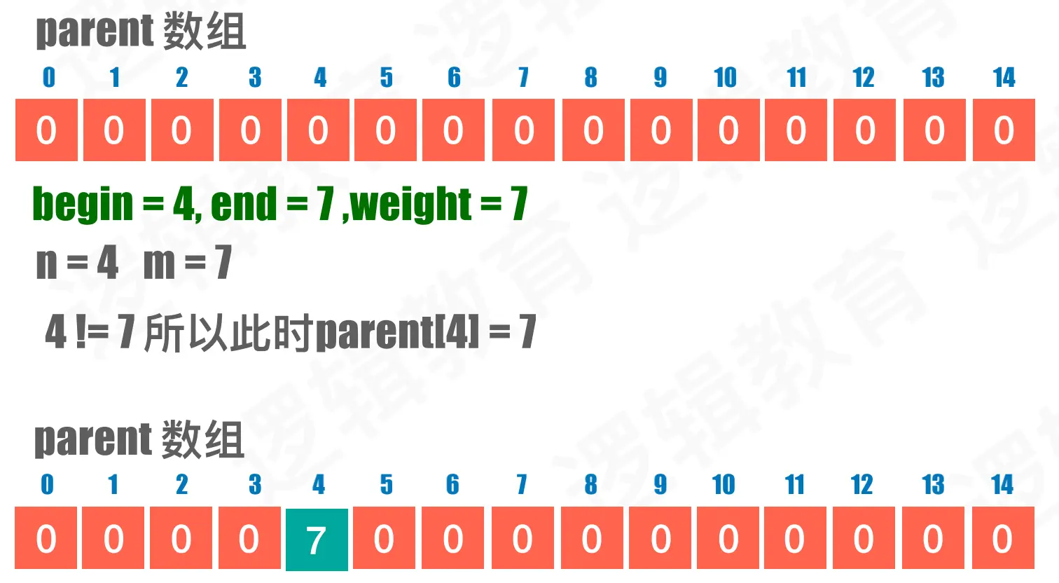 1. 将邻接矩阵 转化成 边表数组; 2. 对边表数组根据权值按照从⼩到⼤的顺序排序; 3. 遍历所有的边, 通过parent 数组找到边的连接信息; 避免闭环问题; 4. 如果不存在闭环问题,则加⼊到最⼩⽣成树中. 并且修改parent 数组举例: