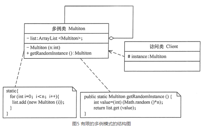 单例模式可扩展为有限的多例(Multitcm)模式,这种模式可生产有限个实例,并保存在ArmyList中,客户需要时可随机获取,其结构如图5所示: