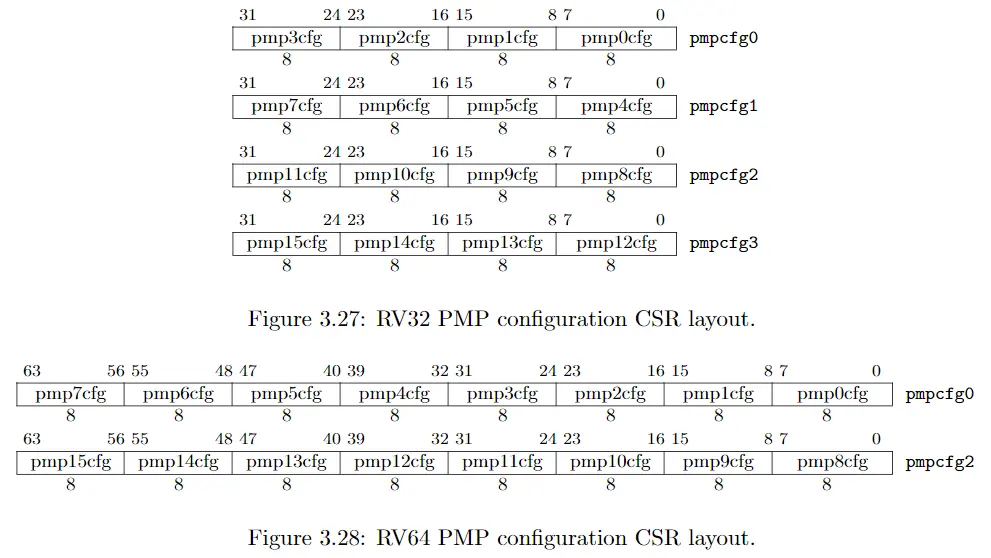 值得注意的是,对于RV64来说,pmp8cfg~pmp15cfg是保存在pmpcfg2中,而不是按顺序保存在pmpcfg1中。这样做是为了使得在RV32和RV64两种情况下,pmp8cfg~pmp11cfg均保存在pmpcfg2中,这样可以减少对于64位支持的开销。