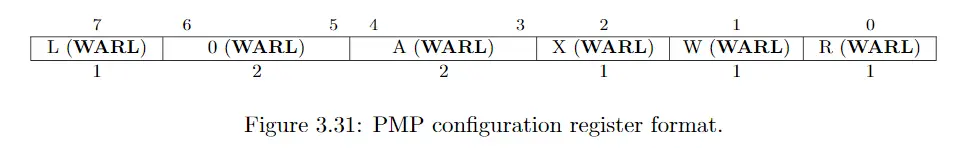 这部分介绍配置寄存器中L field的作用。L字段表示PMP entry处于锁定状态,此时对于配置寄存器和对应的地址寄存器的写入会被忽略。被锁定的PMP entries在hart(hardware thread)重置之前都将保持锁定。