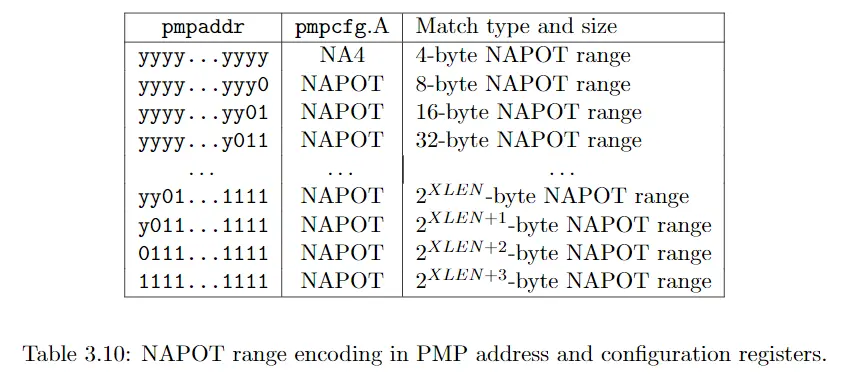 考虑一种边界情况,若pmpaddr值为yyyy...yyyy,此时控制的地址范围即是从yyyy...yyyy开始的4个字节,而pmpcfg.A的值为NA4,即Naturally Aligned Four-byte regions.