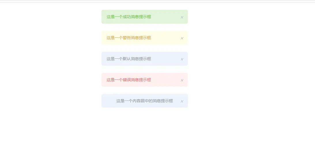 有四种提示框,以及让内容居中,我们不外乎是多加一个类名来写css样式,比如内容居中,我们只需要在html消息提示框容器元素加上一个类名,代码如下: