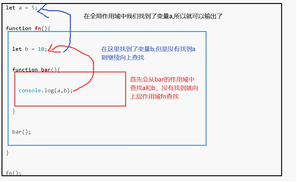 这段代码首先JavaScript引擎会在当前作用域bar中区寻找a和b,没有找到。则向上层作用域fn中继续查找,这时找到了变量b,没有找到变量a,所以继续向上层的全局作用域中查找变量a,这时候找到了变量a,所以可以使用,最后输出5,10;