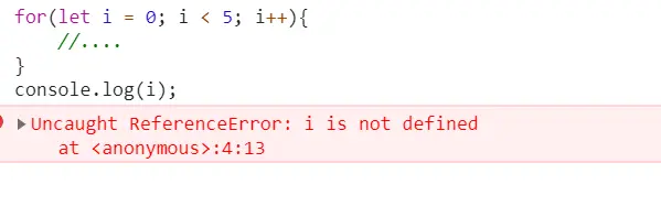 而当我们使用let关键字来定义i时,会报错,这就是块作用域的用处。变量的声明应该距离使用的地方越近越好。