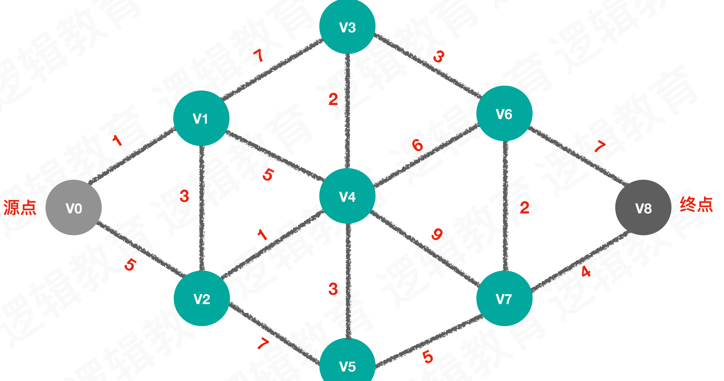 推导最终的最短路径为 V0~V1~V2~V4~V3~V6~V7~V8;