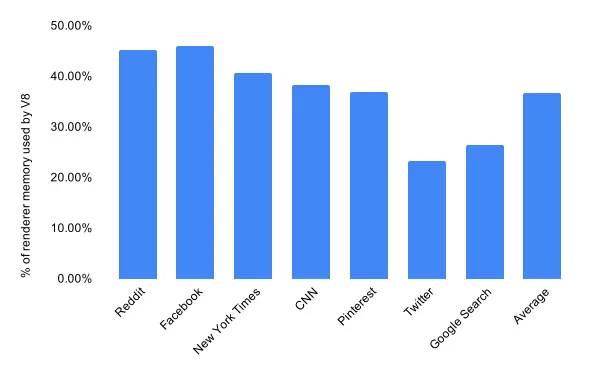 在实施改进之前,我们需要知道我们目前的状况,从而正确的评估如何改进。为了测量当前的内存和性能,我们使用一组可以代表目前流行站点的页面。数据显示在桌面端Chrome渲染进程内存占用中V8占用了60%,平均为40%。