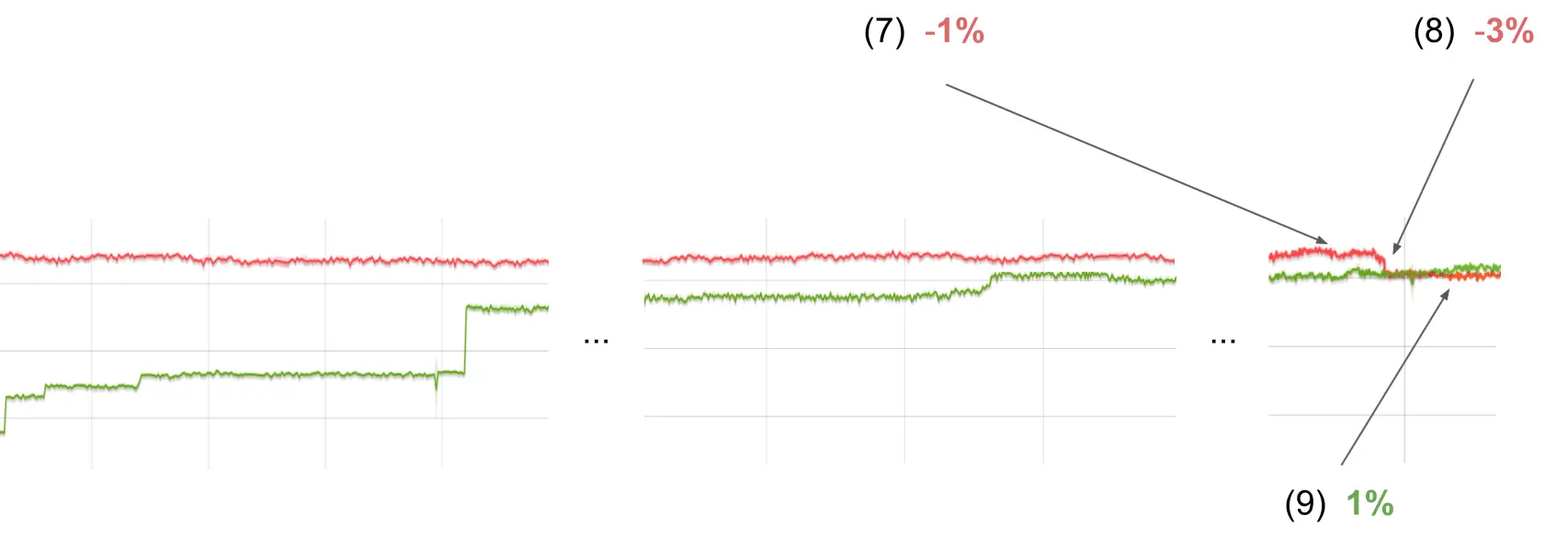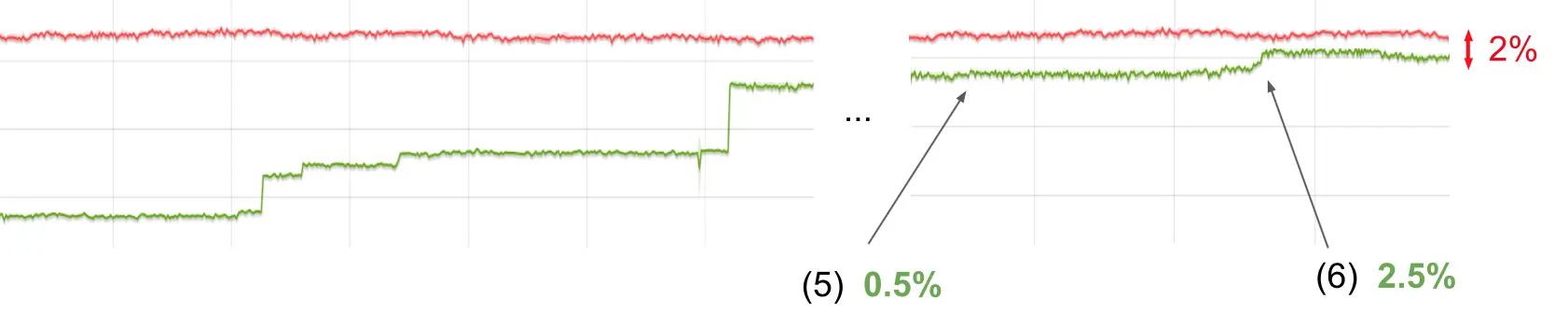 图形显示了在使用指针压缩时Octane在x64架构上的得分。在图中,线越高越好。红色的线是未压缩指针的x64构建,绿色的线是指针压缩的版本。