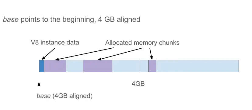 如果我们将V8堆(heap)放在其他地方的连续4GB地址空间,那么一个从base开始的无符号32位偏移量将唯一标识一个指针。