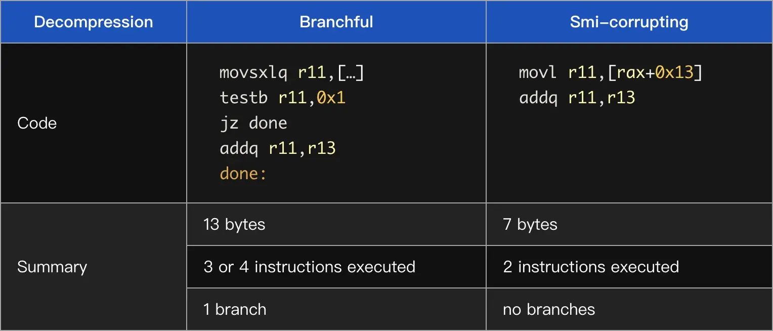 如果我们忽略一个Smi的高32位就可以假定它是undefined。这样,我们就可以避免指针和Smi之间的特殊case,并且可以在解压的时候无条件的添加base,即使是对Smis也可以!我们称这个方法为“Smi-corrupting”。