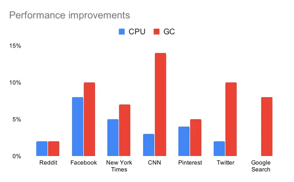 除了这些内存改进,我们还看到了实际性能的改进。在真实网站上,我们使用更少的CPU和垃圾回收时间!