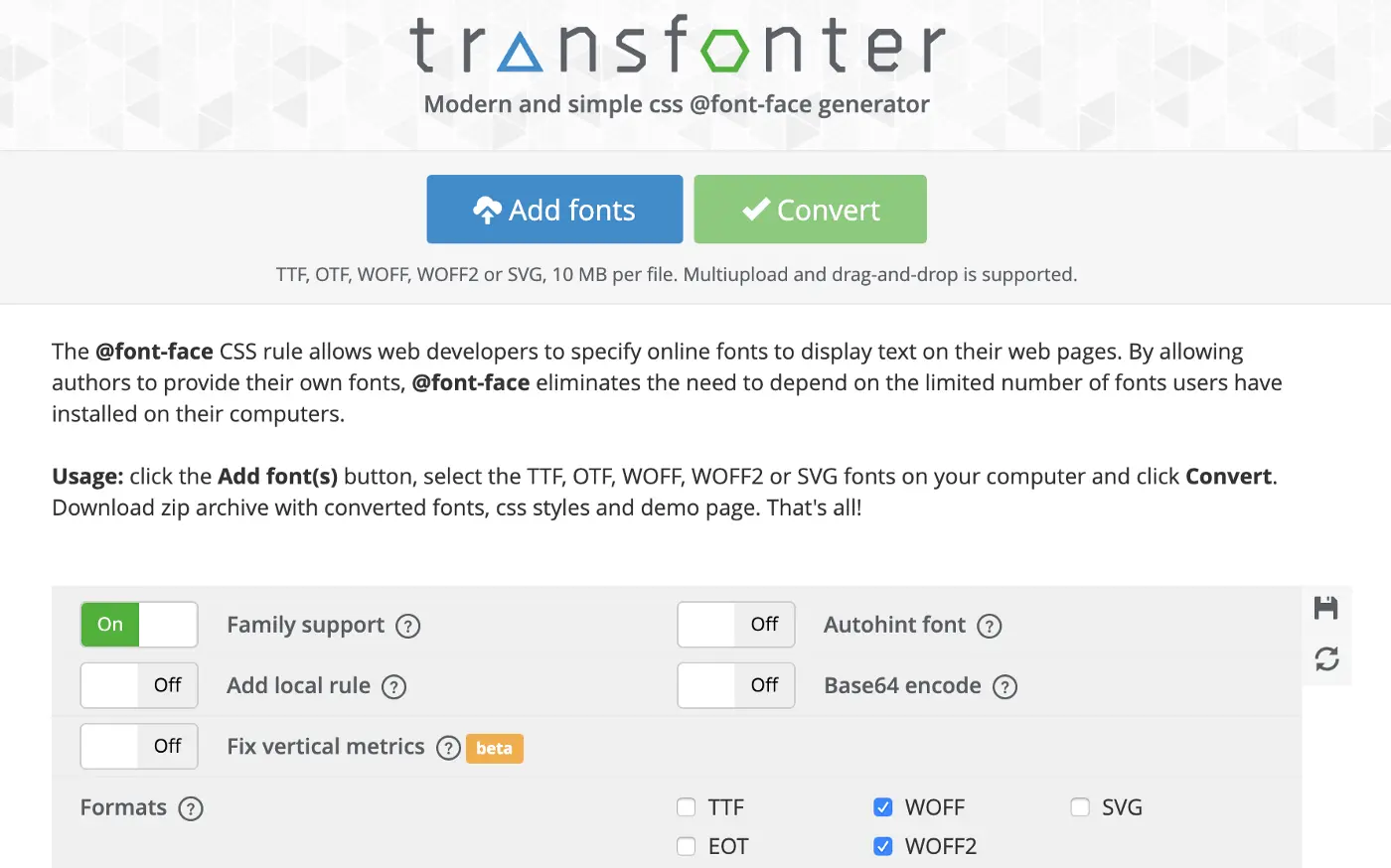 Transfonter是在转换字体时使用的工具,这样你就可以在web上使用它们。它支持许多不同的格式,比如TTF、EOT、WOFF、WOFF2和SVG。