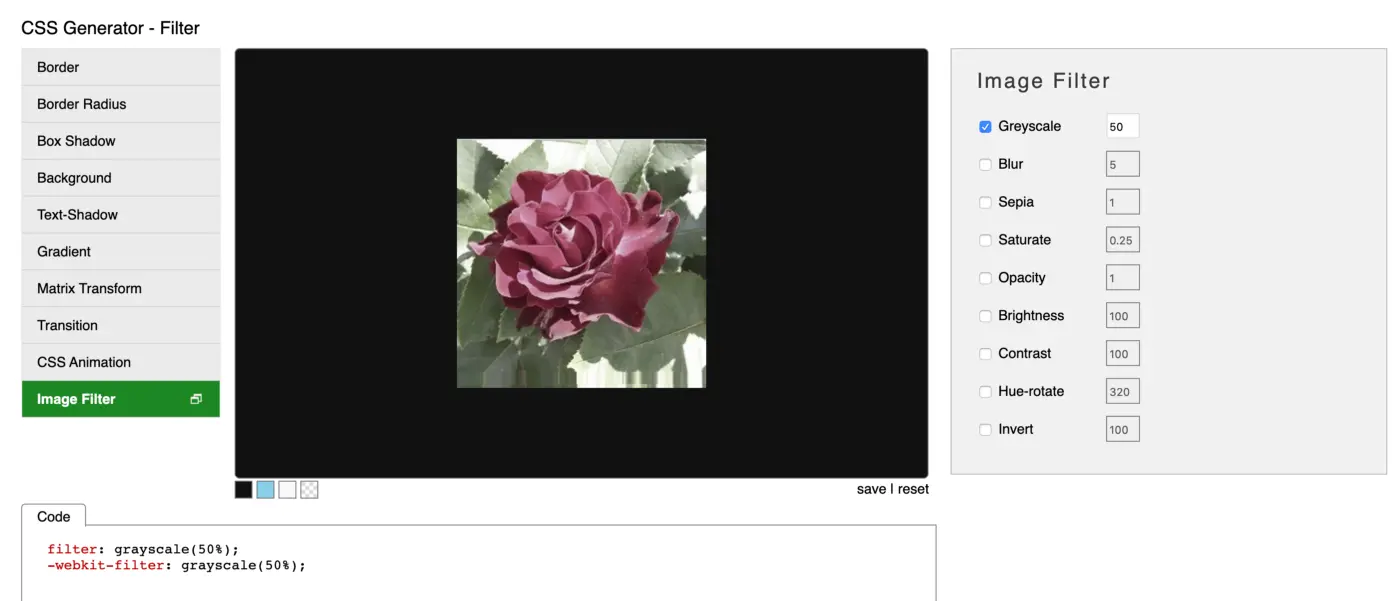 CSS Filter 属性提供了在元素显示之前对元素的渲染效果的访问,如模糊或颜色偏移。该工具允许您试验filter属性所提供的所有可能性。