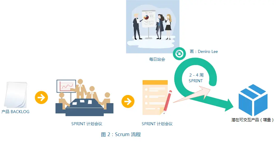 Scrum 是一个用于开发和维持复杂产品的框架,是一个增量的 、 迭代的开发过程。在这个框架中,整个开发过程由若干个短的迭代周期组成,一个短的迭代周期称为一个 Sprint ,每个 Sprint 的建议长度是2到4周 ( 互联网产品研发可以使用1周的 Sprint )。在 Scrum 中,使用产品 Backlog 来管理产品的需求,产品 Backlog 是一个按照商业价值排序的需求列表,列表条目的体现形式通常为用户故事。 Scrum 团队总是先开发对客户具有较高价值的需求。在 Sprint 中, Scrum 团队从产品 Backlog 中挑选最高优先级的需求进行开发。挑选的需求在 Sprint 计划会议上经过讨论 、 分析和估算得到相应的任务列表,我们称它为 Sprint backlog。在每个迭代结束时, Scrum 团队将递交潜在可交付的产品增量。 Scrum 起源于软件开发项目,但它适用于任何复杂的或是创新性的项目。 Scrum 的基本流程如图 2 所示。