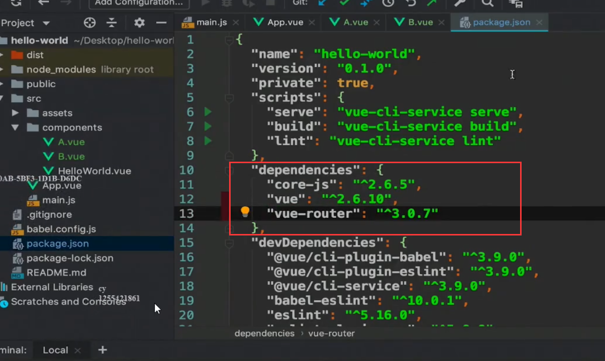然后就可以在package.json里的dependencies看到vue-router,因为vue-router是我们运行时,需要使用的库,所以装在dependencies里面;