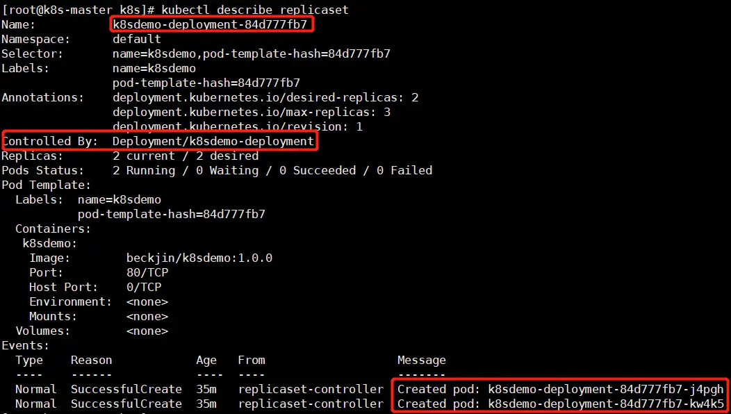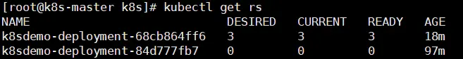 查看 k8sdemo-deployment 所控制的 ReplicaSet 信息: