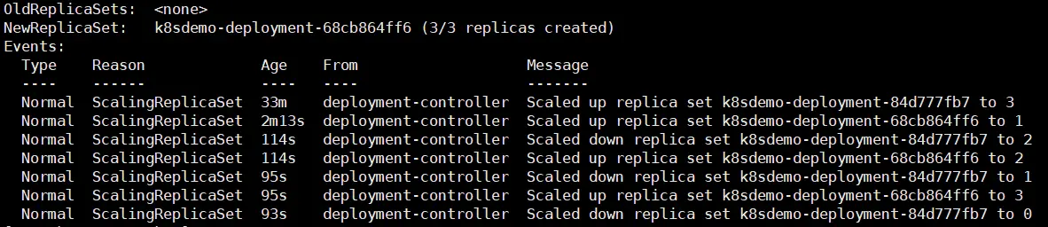 Deployment 控制器根据修改后的 Pod 模板,创建新的 ReplicaSet(k8sdemo-deployment-68cb864ff6),Pod 数默认是 0,然后老的 ReplicaSet (k8sdemo-deployment-84d777fb7)Pod 数逐渐减少,新的 ReplicaSet 的 Pod 数逐渐增加,两个过程交替进行,新的增加一个,老的减少一个,直到全部升级完成。