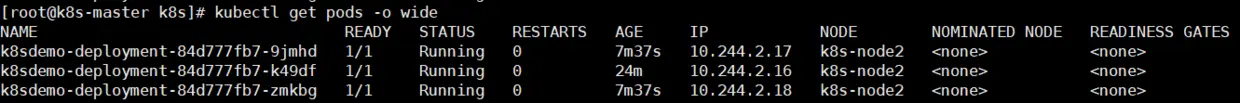 要实现 Pod 的伸缩只需要调整配置文件中的 replicas 字段,如扩展为 3 个,扩展完成后结果如下: