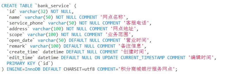 然后来看下这个需求:很明显是要在我们系统维护一个【银行网点】的功能,然后提供一些接口给【积分商城】使用,于是我设计了如下的两张表