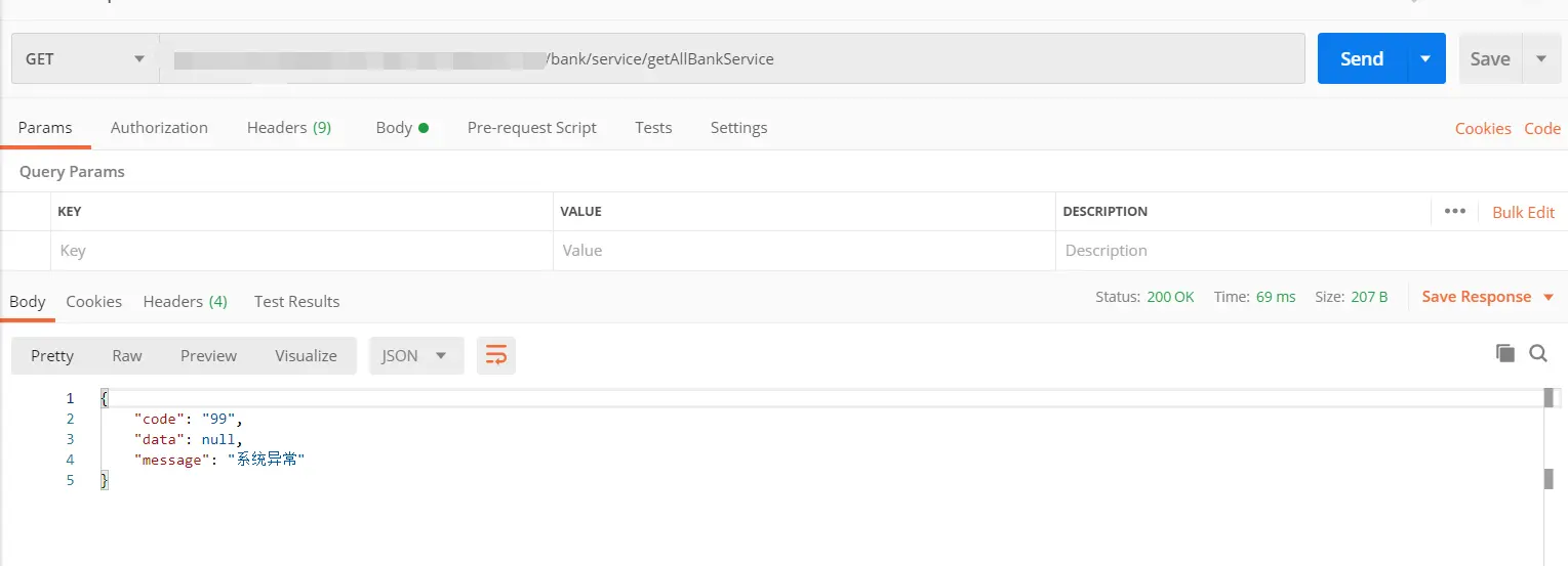 可以看到bank/service/getAllBankService这个接口仅支持post请求,所以服务器内部会抛出HttpRequestMethodNotSupportedException异常,然后可以看到,此异常已经被全局异常处理器捕获到并且返回了我们统一的响应对象
