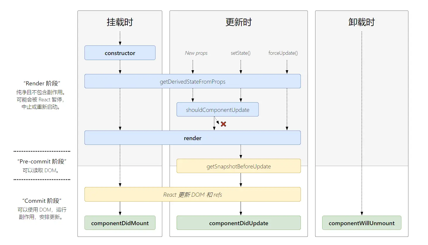 static getDerivedStateFromProps(props, state),这是个静态方法,函数体内不能访问this。getDerivedStateFromProps 会在调用 render 方法之前调用,并且在初始挂载及后续更新时都会被调用。它应返回一个对象来更新 state,如果返回 null 则不更新任何内容。由上方的react生命周期图可以看出,在state对象初始化后,会自动调用一次该方法;当state发生改变时,也会调用该方法;如果是一个父子组件,当父组件中的state发生改变而影响到子组件中的值时,子组件中的getDerivedStateFromProps也会自动调用。getDerivedStateFromProps的推出,同时删除了一组生命周期API,包括: