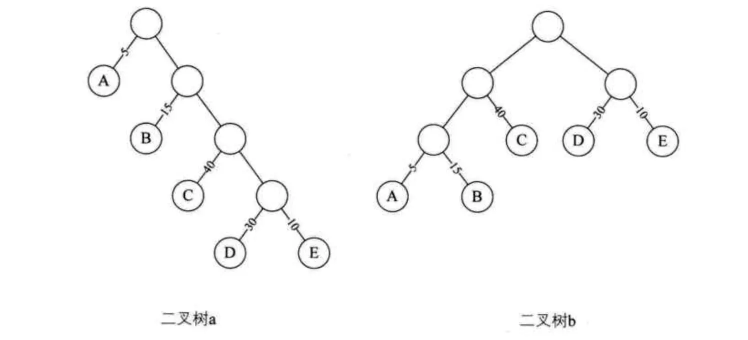 如上图所示,二叉树a中,结点A到结点B之间的路径长度为3,树的路径长度为1+1+2+2+3+3+4+4=20,树的带权路径长度为5*1+15*2+40*3+30*4+10*4=315。二叉树b中,结点A到结点B之间的路径长度为2,树的路径长度为1+2+2+3+3+1+2+2=16,树的带权路径长度为5*3+15*3+40*2+30*2+10*2=220。