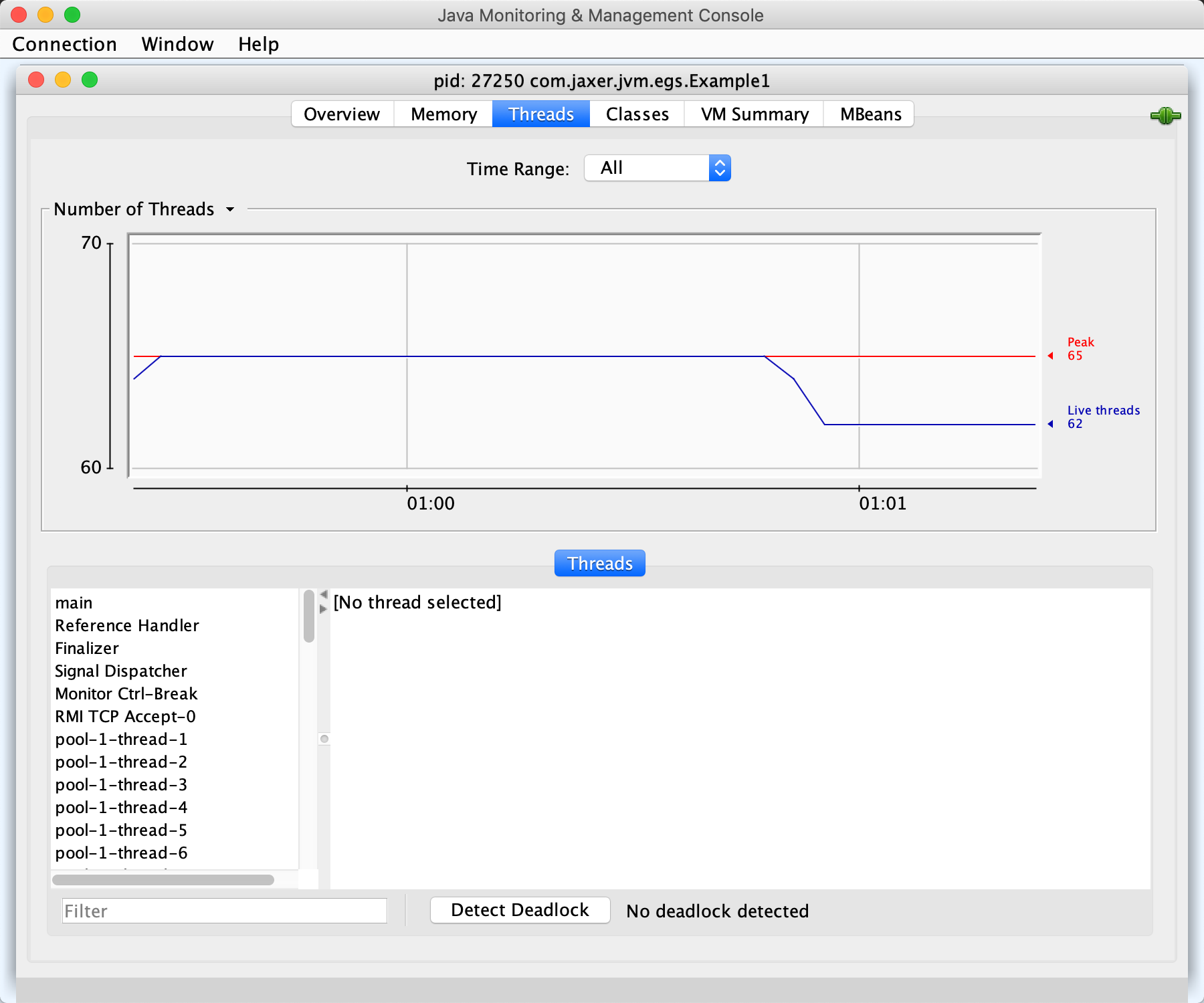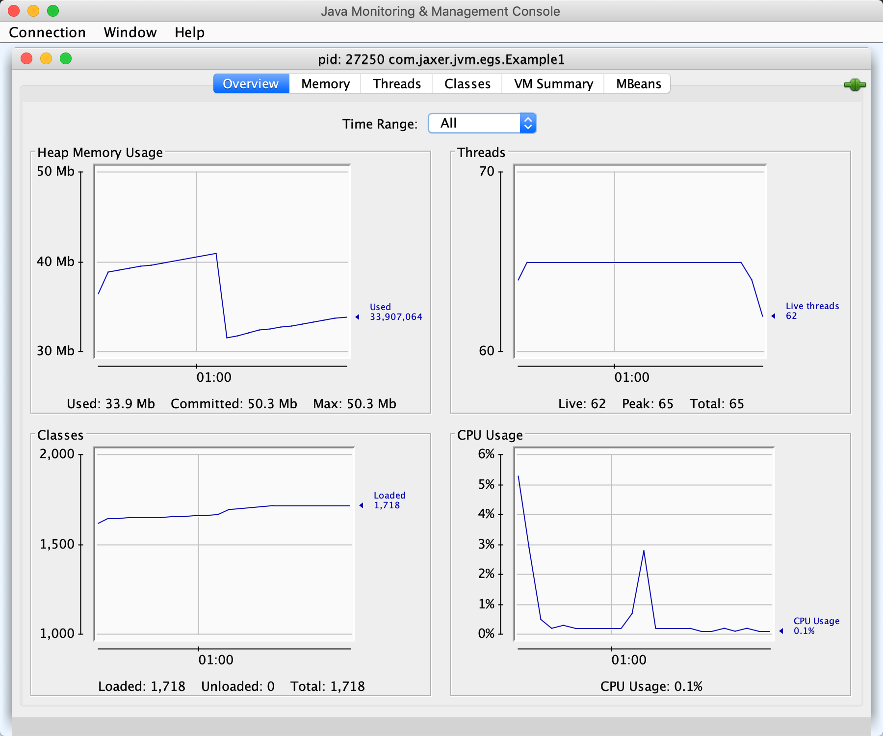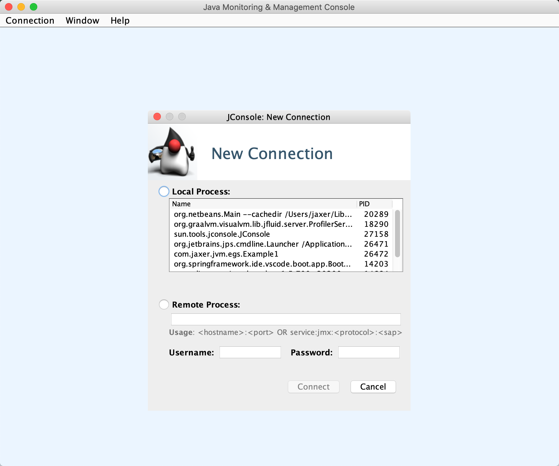 14966 Example1 -Dvisualvm.id=44321340563858 -Xmx50m -Xms50m -XX:+PrintGCDetails -javaagent:/Applications/IntelliJ IDEA.app/Contents/lib/idea_rt.jar=61849:/Applications/IntelliJ IDEA.app/Contents/bin -Dfile.encoding=UTF-8