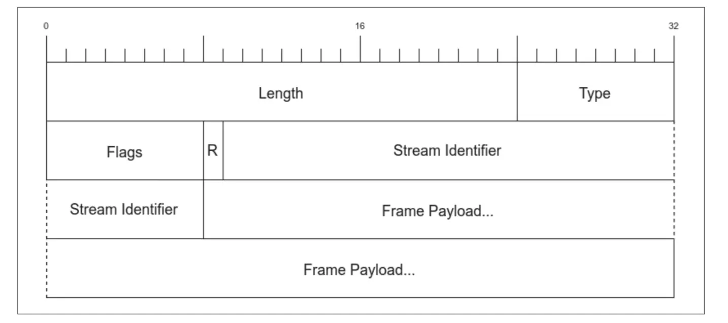 下图是 HTTP/2 的帧结构,其中前 9 个字节(Length、Type、Flag、R Stream Identifier)的格式对于每一帧来说都是一致的,所以解析时候只需相应的读取这些字节,就可以知道整个帧的字节数。