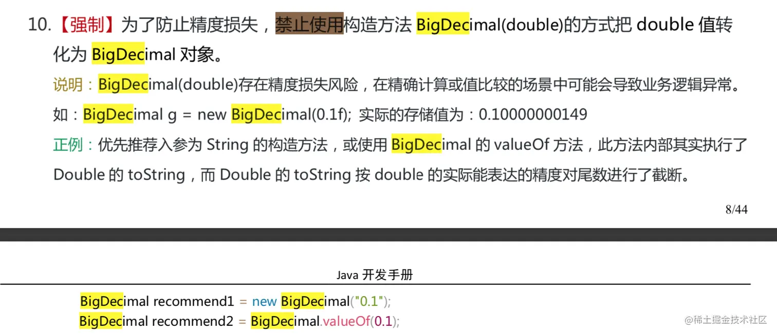 注意:我们在使用BigDecimal时,为了防止精度丢失,推荐使用它的 BigDecimal(String) 构造方法来创建对象。《阿里巴巴Java开发手册》对这部分内容也有提到如下图所示。