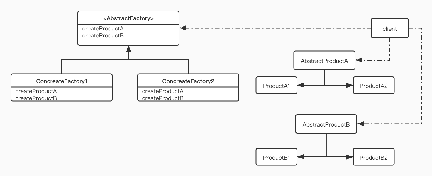 AbstractFactory将创建Product的实现细节隐藏在具体子类ConcreateFactory中。这种方案下,将来需要新增类型时,通过添加ConcreateFactory和Product即可实现。