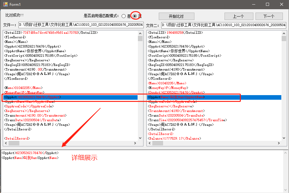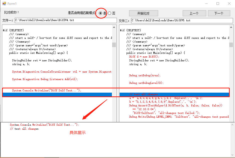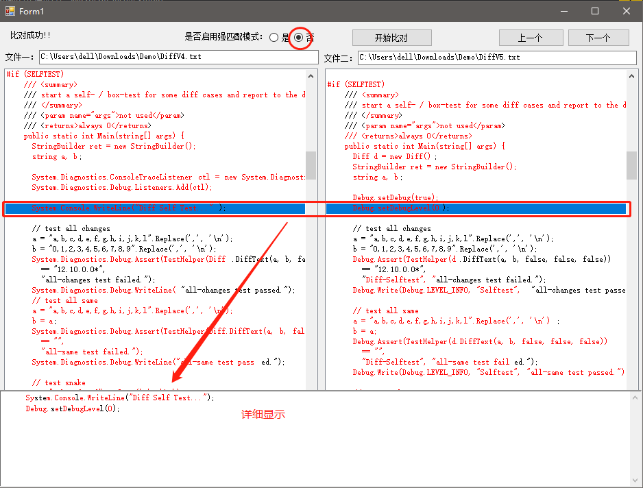tip:强匹配模式说明:是则代表比对时自动识别码行问题,否则按原文本进行每行比对