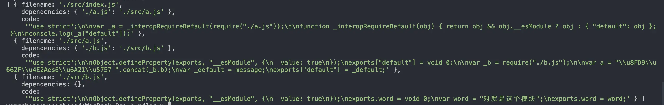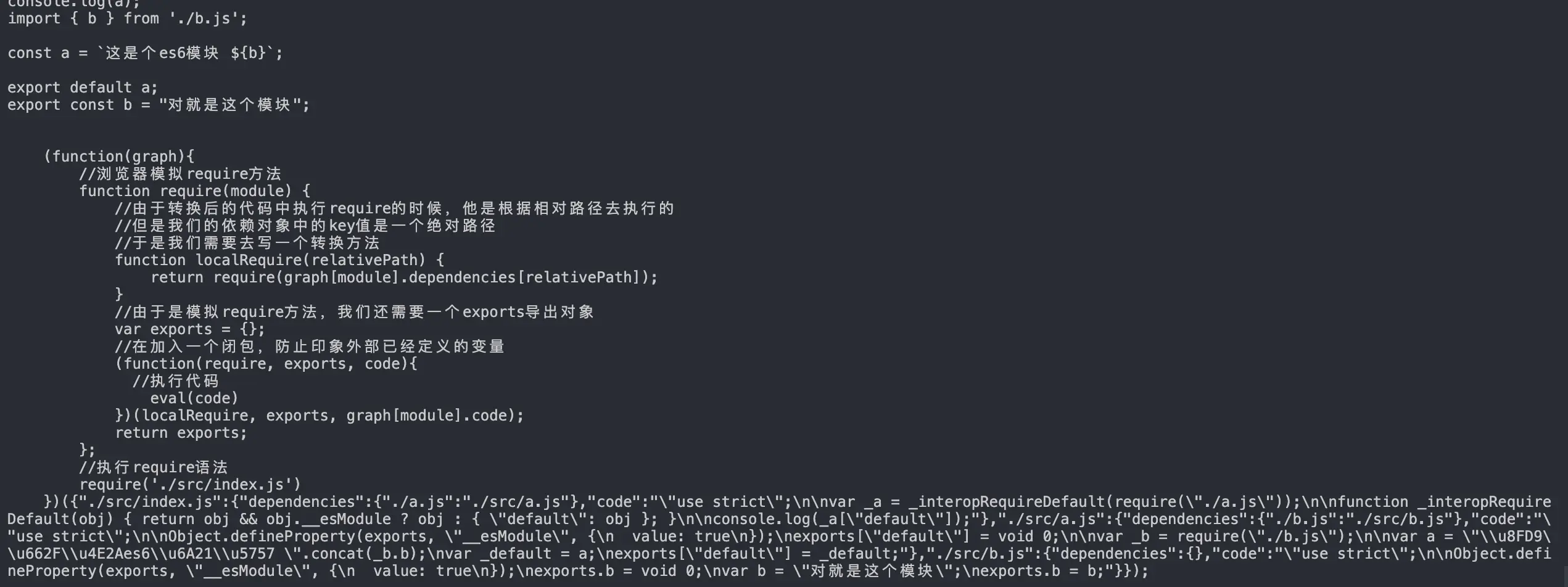 上边代码中,我们发现,我们通过一个自定义的require语法就能实现,整个依赖图谱的代码执行,并且不会污染全局环境,我们来看一下导出的结果
