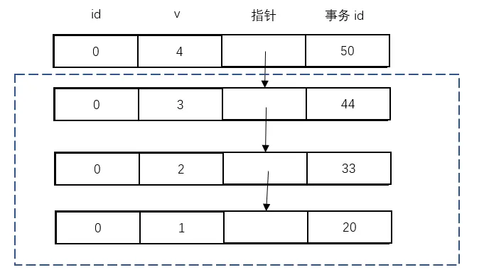 在最上面的虚线方框外的那行数据,代表了最新的id为0的数据,此时的v为4,这行数据是由id为50的事务更改的。