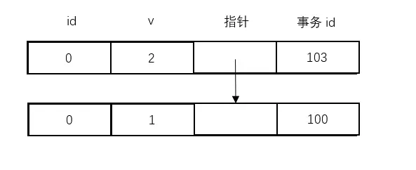 还是上面提到的表t,他有两个字段,id和v。然后加上了InnoDB自动添加的指针字段和事务id字段,省略了行id字段。